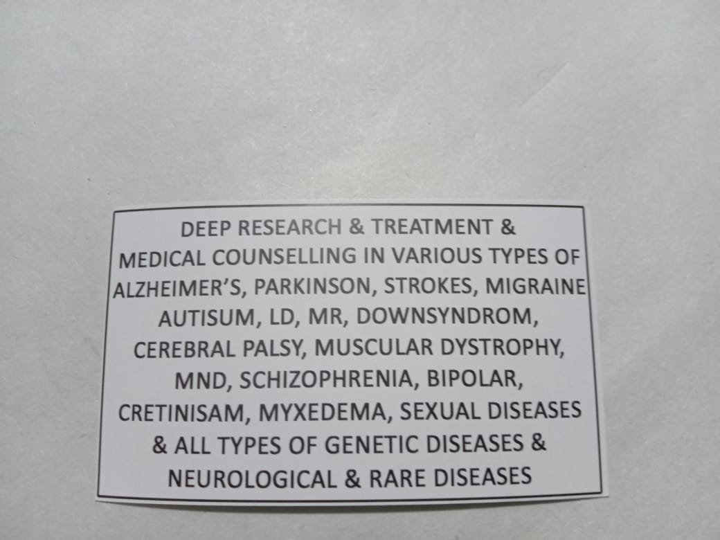 Specialized in Child Psychology,Brain related disease in Childs, Abnormal behavior in Childs, Child crimes, psychological counseling,Psychotherapy, Expert in diagnosis, prognosis & rehabilitation & addiction therapist.Medical Researcher in Alzheimer diseases, Autism,Dementia,Endogenic depression, Parkinson,MMD,Multiple Sclerosis/Migraine/Strokes/Spinal Cord Quadriplegia etc.